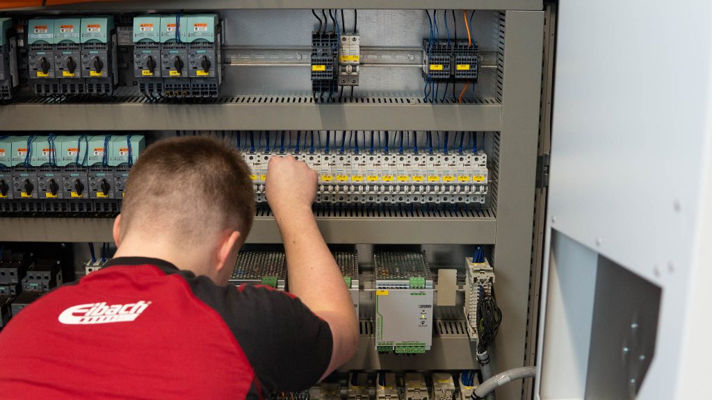 Eine Person in einem rot-schwarzen Eibach-Shirt arbeitet an einem offenen elektrischen Bedienfeld und passt Kabel und Komponenten im Inneren des Schranks an oder überprüft sie.